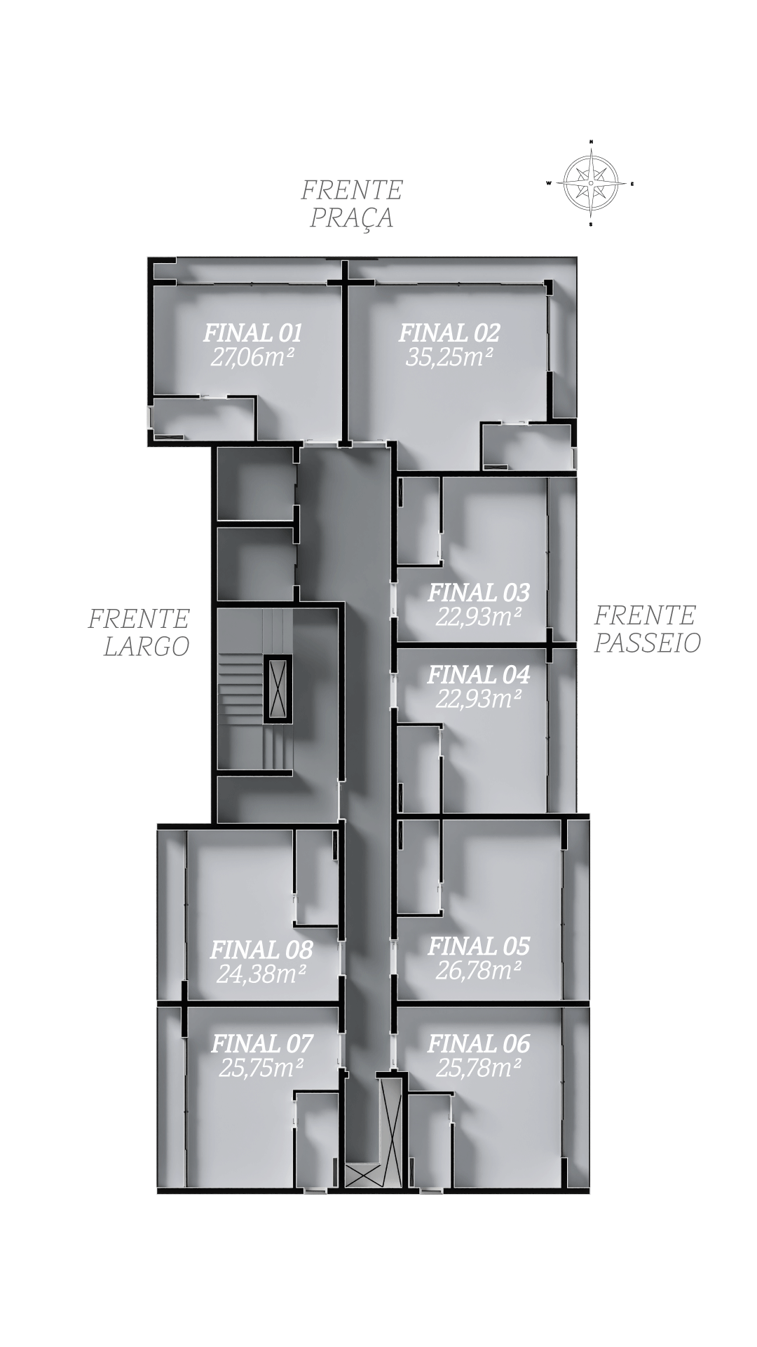 - Studios (3º ao 7º andar): Pé direito com 2,68m.